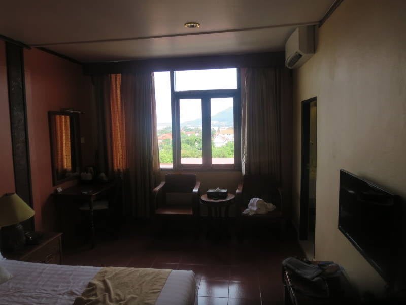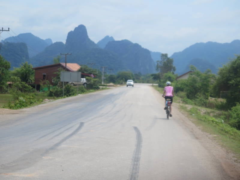 De weg is weer lekker rustig geworden en met rechts van ons op een paar honderd meter de sprookjesbergen fietsen we door totdat we bij het guesthouse zijn, helaas niet zo mooi als in Thakhek maar wel een prima kamer met uitzicht en balkon en voor slechts 100000 Kip (€ 10).