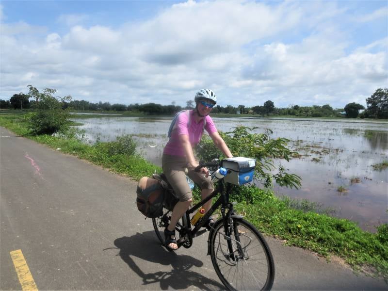 We krijgen het ritme al aardig te pakken want voor negenen zitten we op de fiets en rijden we weer door het mooie landschap richting Prasat. De rijstvelden, rubberbomen, cassaves en andere landbebouwingen trekken aan ons voorbij, weinig jungle vandaag, wel monniken, veel zwaaiende mensen en iemand op een brommer met zijspan die 15 km achter Barbara aan meerijdt.