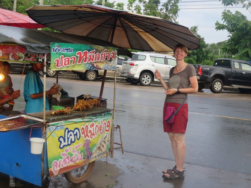 's Avonds eten we langs de weg bij een restaurant dat volgens het bord buiten pizza's zou moeten verkopen. Het restaurant is van een aardige Thaise die een aantal jaar in Australië heeft gewoond maar nu weer terug thuis is. Wel fijn om eens goed uit te kunnen leggen wat we willen eten en natuurlijk ook gewoon om een praatje te maken. We nemen pizza en nog wat Thais eten. De pizza lijkt inderdaad op een pizza en de bodem is ook ongeveer zaols we gewend zijn en daarmee houdt de vergelijking met een pizza zoals wij die kennen op.